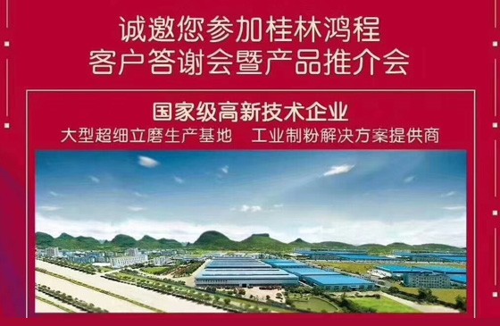 磨粉機(jī)廠家桂林鴻程公司2019年6月6日在河南南召縣舉行客戶答謝會 磨粉機(jī)廠家桂林鴻程公司計劃于6月6日在河南南召縣舉行客戶答謝會暨產(chǎn)品推介會,誠邀各界人士參...